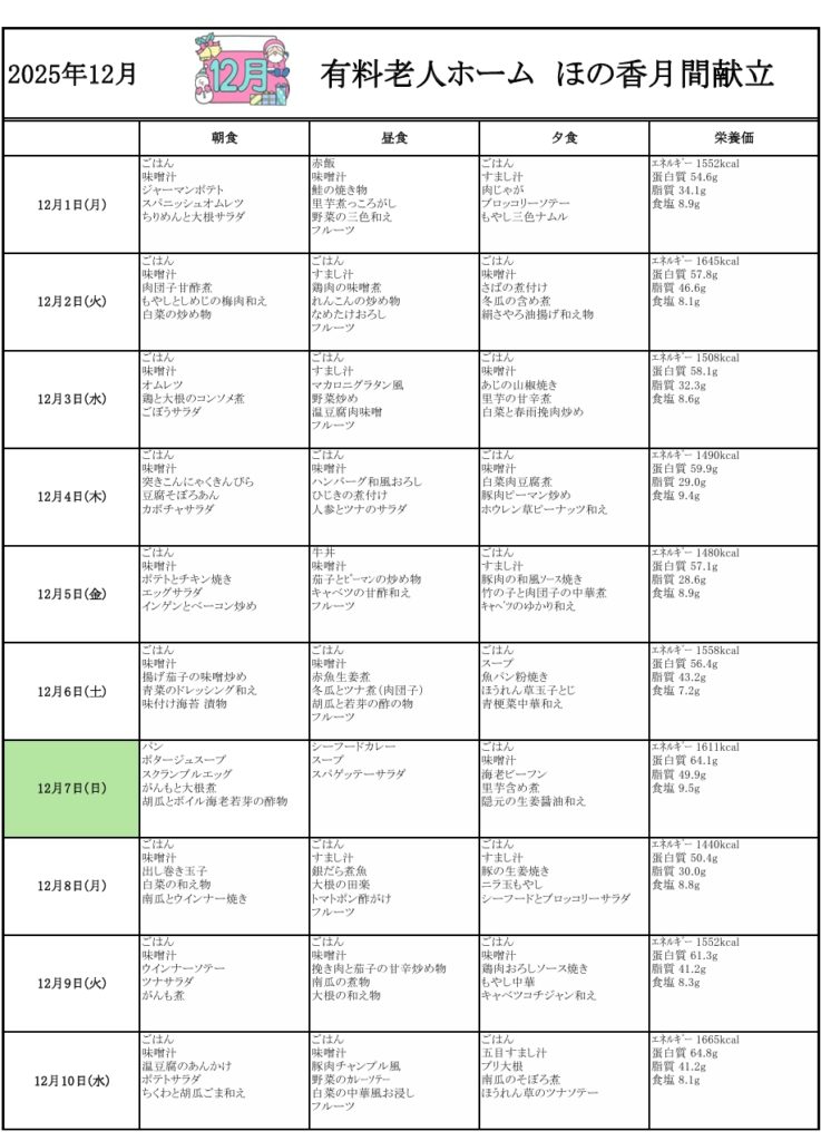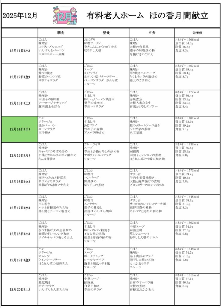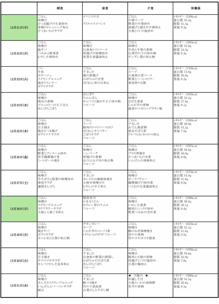 12月のメニュー表